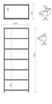 Стелаж металевий з профилю 20х20х1.2 або більше, чорного кольору. Стелаж має 20мм кутик для вкладних полиць 18 ЛДСП. Висота між полицями 350мм або більше.
